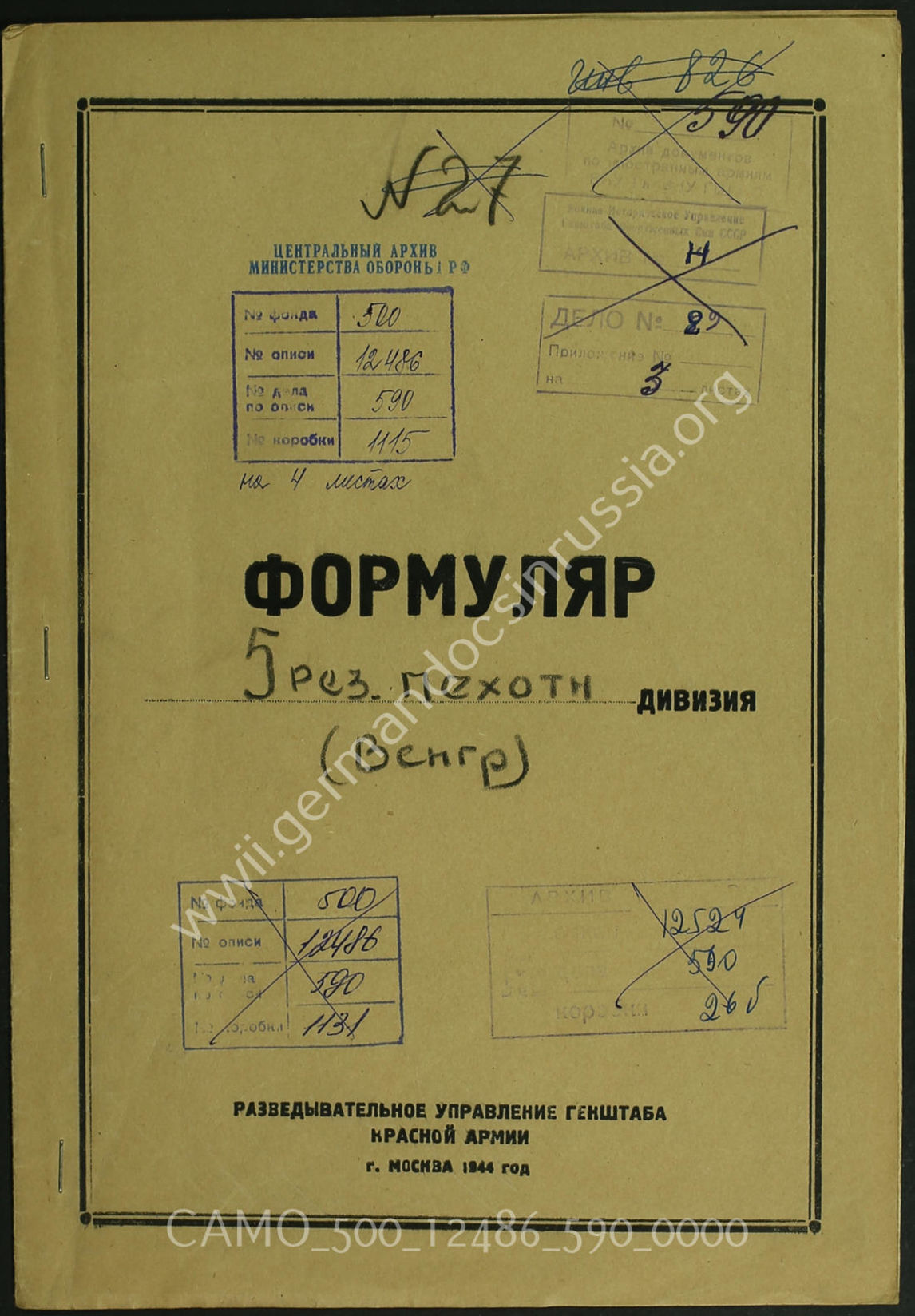Akte 590: Unterlagen der Aufklärungsverwaltung des Generalstabes der Roten Armee: Erfassungsbögen mit Aufklärungsinformationen zur königlich ungarischen 5. Reservedivision