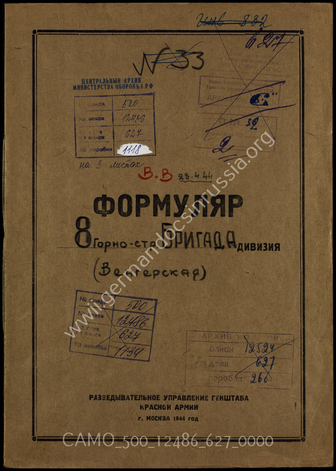 Akte 627: Unterlagen der Aufklärungsverwaltung des Generalstabes der Roten Armee: Erfassungsbogen mit Aufklärungsinformationen zur königlich ungarischen 8. Grenzschutz-Brigade (in den sowjetischen Akten als 8. Gebirgsschützen-Brigade geführt)