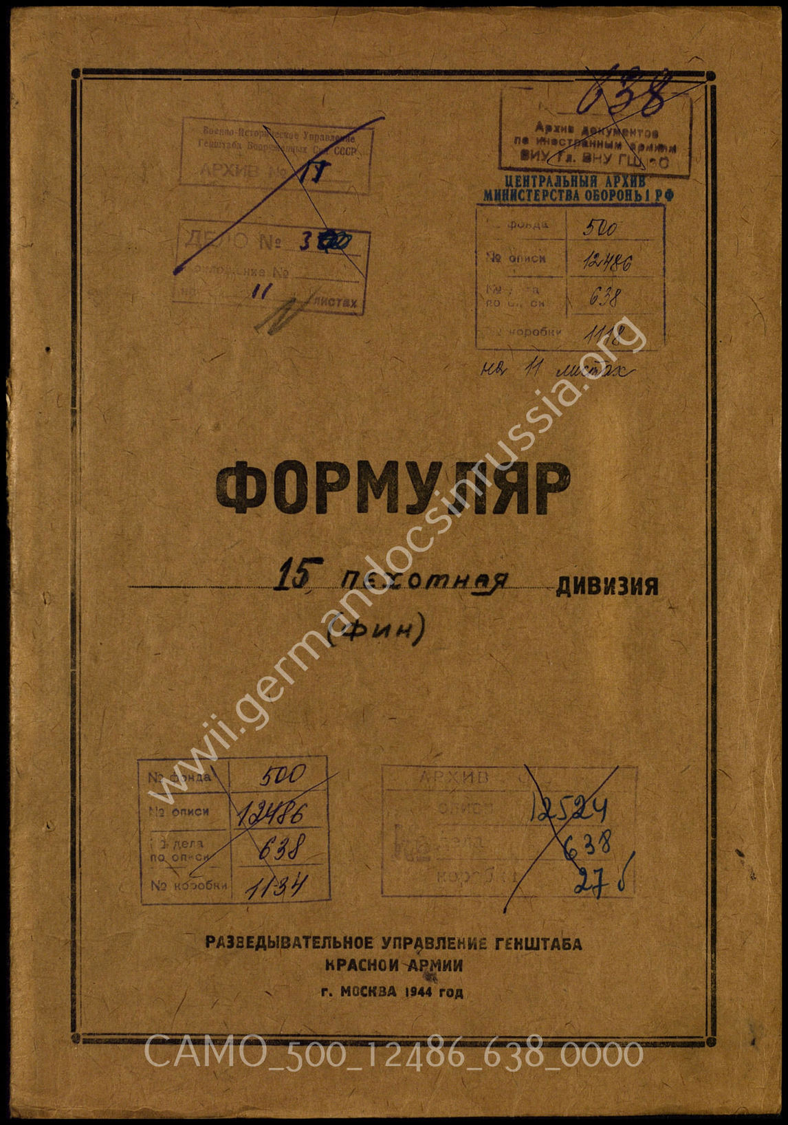 Akte 638: Unterlagen der Aufklärungsverwaltung des Generalstabes der Roten Armee: Erfassungsbögen mit Aufklärungsinformationen zur finnischen 15. Infanteriedivision, Auskunftsschreiben