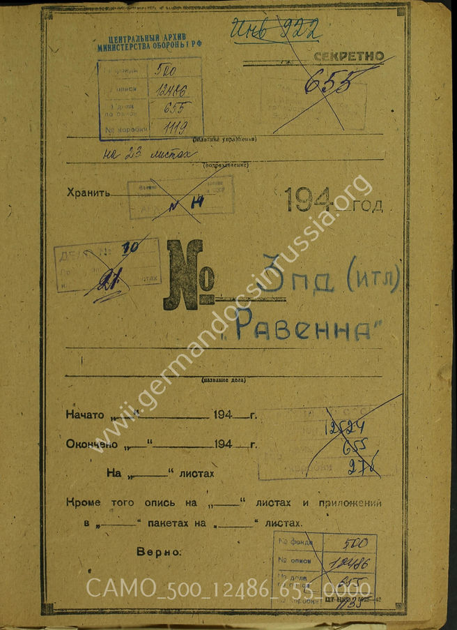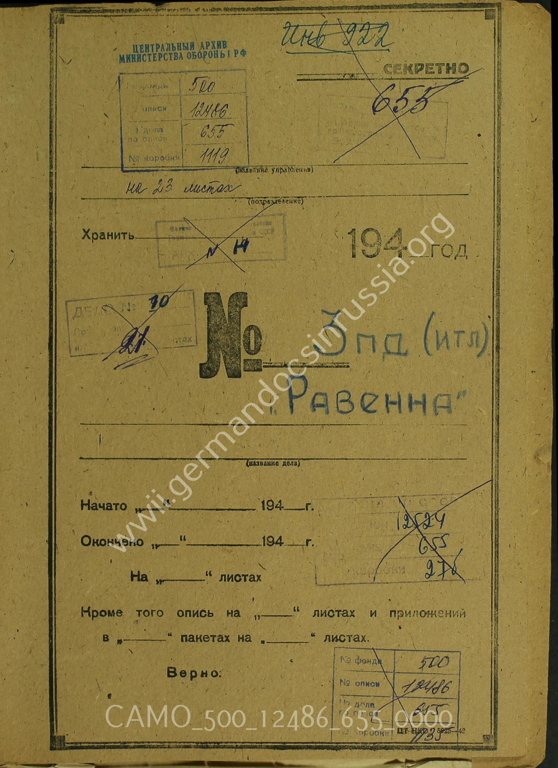 Akte 655: Unterlagen der Aufklärungsverwaltung des Generalstabes der Roten Armee: Erfassungsbögen mit Aufklärungsinformationen zur königlich italienischen 3. Infanteriedivision „Ravenna“, Verhöre von Kriegsgefangenen u.a.