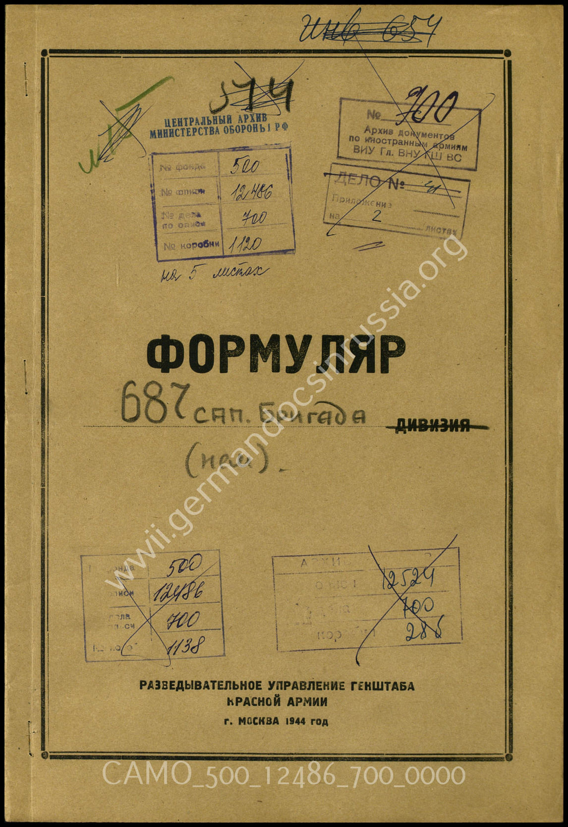 Akte 700: Unterlagen der Aufklärungsverwaltung des Generalstabes der Roten Armee: Erfassungsbogen mit Aufklärungsinformationen zur Heeres-Pionier-Brigade 687, Verhör des kriegsgefangenen Oberfeldwebels Konrad Rauber