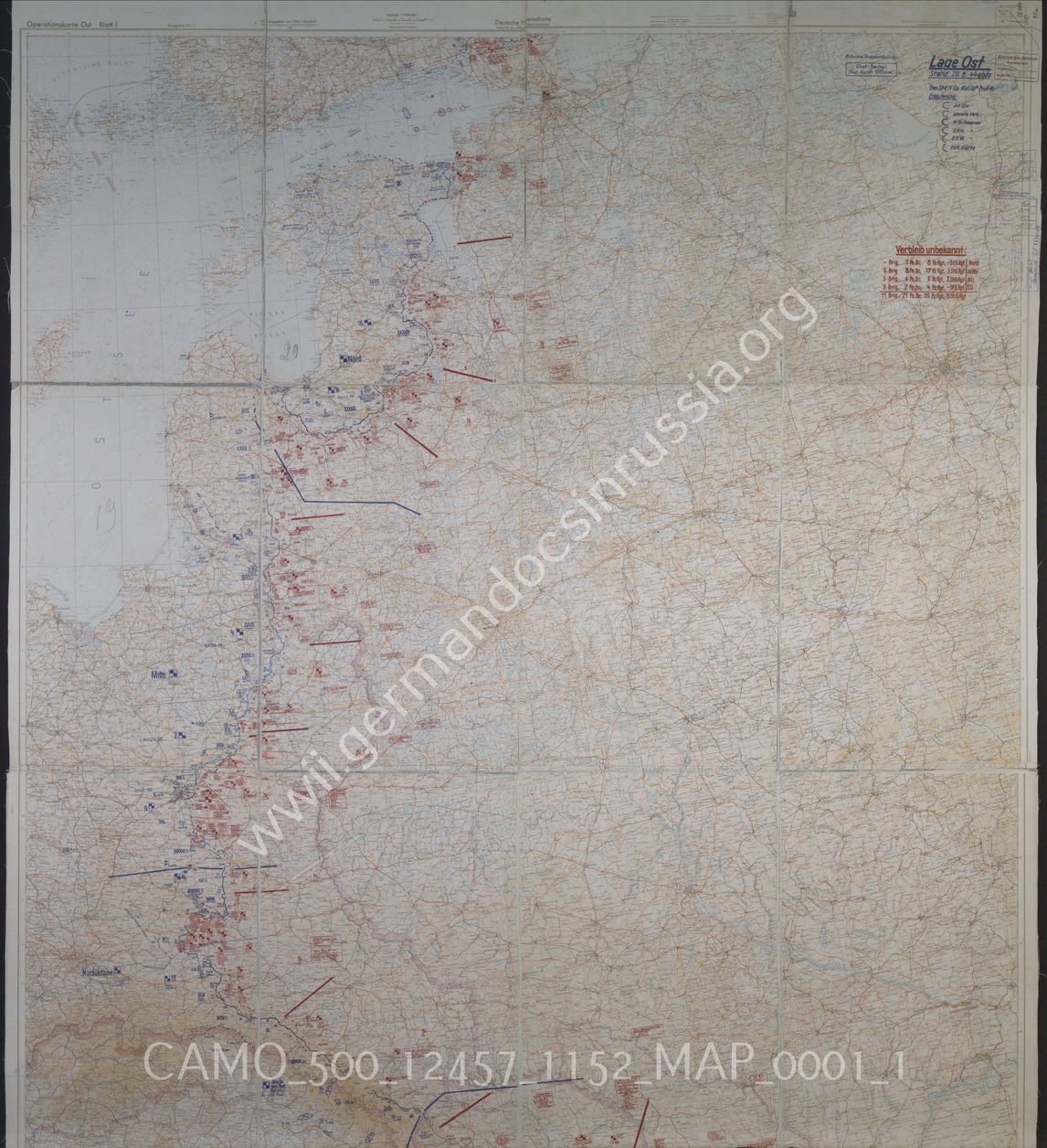 Akte 1152: Unterlagen der Operationsabteilung IIIb des Generalstabs des Heeres im OKH: Karte „Lage Ost“ – Karte zur Lage der Truppen der Wehrmacht an der deutsch-sowjetischen Front, einschließlich der Lage der Verbände der Roten Armee, Stand 20.08.1944