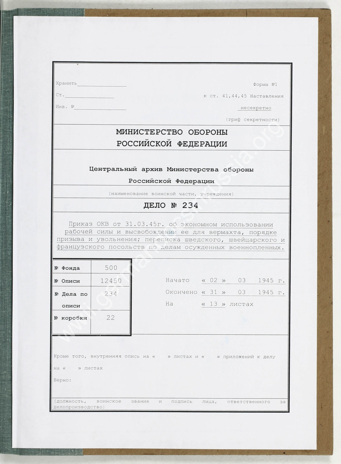 Top CAMO - Bestand 500 Findbuch 12450 - Oberkommando der Wehrmacht (OKW) Akte 234. Briefwechsel der schwedischen, schweizerischen und franz...