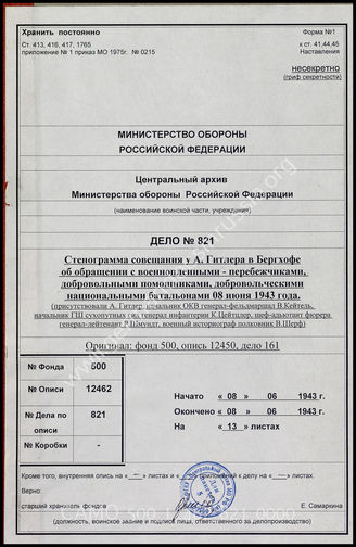Akte 821: Unterlagen des Übersetzungsbüros des 6. Archivdepots des CAMO: Übersetzung von Unterlagen des Wehrmachtführungsstabes im OKW – Stenogramm der Besprechung bei A. Hitler auf dem Berghof über die Behandlung von Kriegsgefangenen u.a., 8.6.1943