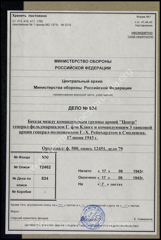 Akte 824: Unterlagen des Übersetzungsbüros des 6. Archivdepots des CAMO: Übersetzung von Unterlagen der Ia-Abteilung der Heeresgruppe Mitte – Mitschrift der Besprechung zwischen Generalfeldmarschall von Kluge und Generaloberst Reinhardt, 17.6.1943