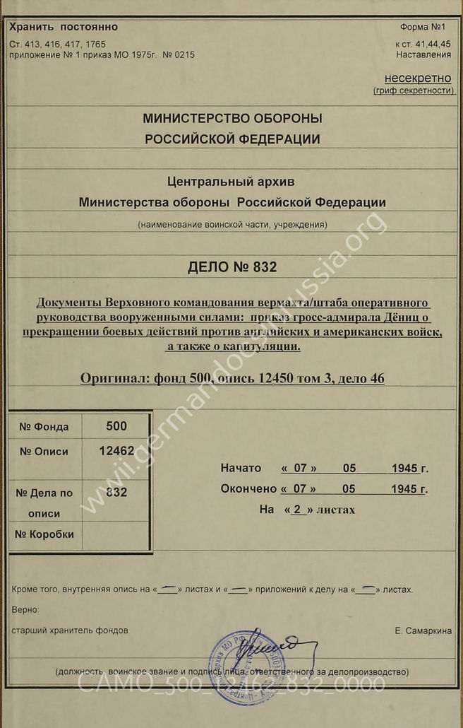 Akte 832: Unterlagen des Übersetzungsbüros des 6. Archivdepots des CAMO: Übersetzung von Unterlagen des Wehrmachtführungsstabes im OKW – Befehl von Großadmiral Dönitz über die Einstellung der Kampfhandlungen, 7.5.1945