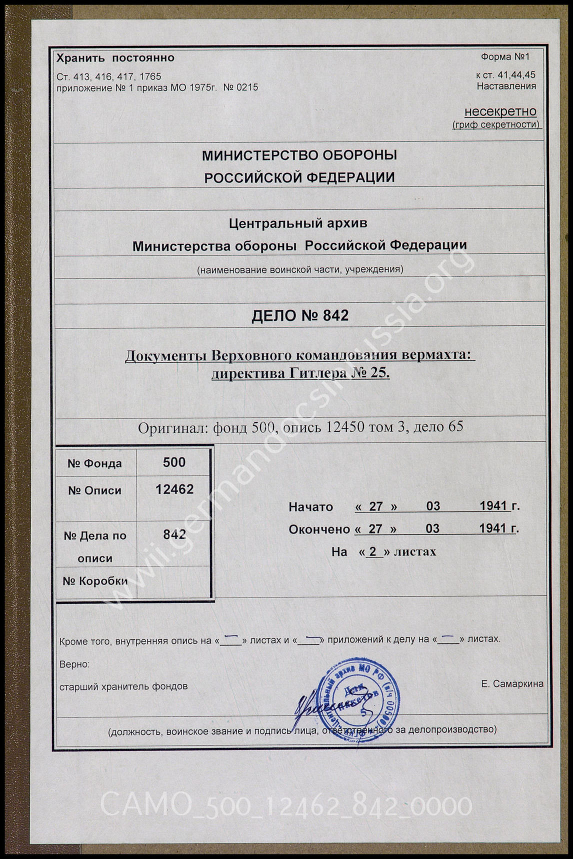 Akte 842: Unterlagen der kriegsgeschichtlichen Verwaltung des Generalstabes der Streitkräfte der UdSSR: Übersetzung von Unterlagen der Operationsabteilung im OKW – Hitlers Weisung Nr. 25 für die Kriegführung (Angriff auf Jugoslawien), 27.3.1941