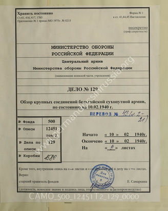 Akte 129: Unterlagen der Abteilung Fremde Heere West beim Generalstab des Heeres im OKH: Übersicht über die großen Einheiten des belgischen Heeres, Stand 10. Februar 1940