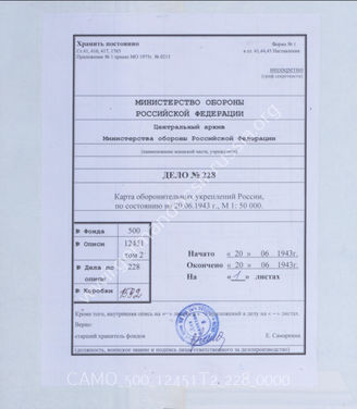 Akte 228: Unterlagen der Vermessungs- und Kartenabteilung (mot.) 618: Befestigungskarte (O-36-121) des Raums Nowosokolniki (Kleinstadt im Oblast Pskow), M 1:50.000, Stand 20. Juni 1943