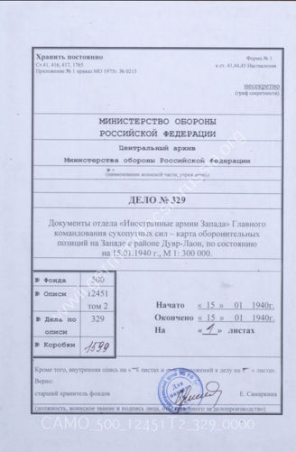 Akte 329: Unterlagen der Abteilung Fremde Heere West beim Generalstab des Heeres im OKH: Stellungskarte West – (Dover-Laon), M 1:300.000, Stand 15. Januar 1940