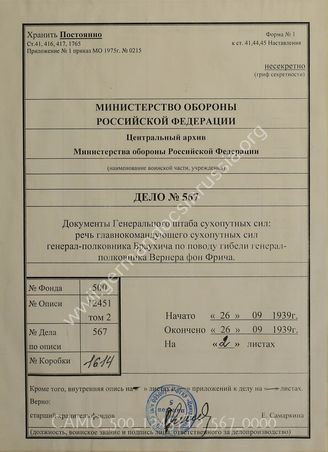 Akte 567: Rede des Oberbefehlshabers des Heeres Generaloberst von Brauchitsch anlässlich des Staatsaktes für den auf dem Felde der Ehre gebliebenen Generaloberst Freiherr von Fritsch, Meldung zum Tod von Fritsch