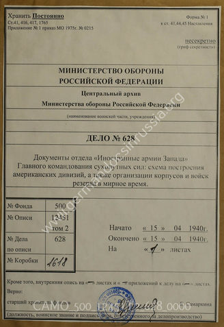Akte 628: Unterlagen der Abteilung Fremde Heere West (III) beim Generalstab des Heeres im OKH: Schema der amerikanischen Volldivisionen und Friedensgliederung der Korps- und Heerestruppe, Stand 15. April 1940