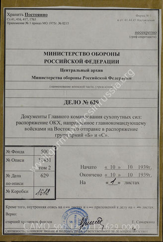 Akte 629: Unterlagen der Ia-Abteilung der Heeresgruppe B: Schreiben der Operationsabteilung (I) im OKH an den Oberbefehlshaber Ost mit der Übersicht von Verbänden, die im Herbst 1939 aus Polen verlegt und den Heeresgruppen B bzw. C unterstellt werden
