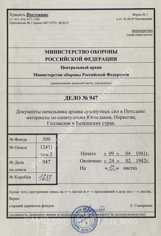 Akte 947: Unterlagen des Heeresarchivs in Potsdam: Schriftwechsel mit dem Chef der Heeresarchive zu Kapitulationsverhandlungen in Polen, Norwegen, Belgien, den Niederlanden und Jugoslawien und der Übergabe entsprechender Schriftstücke u.a.