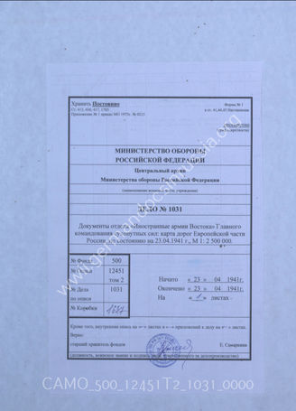 Akte 1031: Unterlagen der Abteilung Fremde Heere Ost beim Generalstab des Heeres im OKH: Karte zur Lage von Verbänden der Roten Armee an der deutsch-sowjetischen Demarkationslinie sowie im europäischen Teil der Sowjetunion, M 1:2.500.000, 23. April 1941