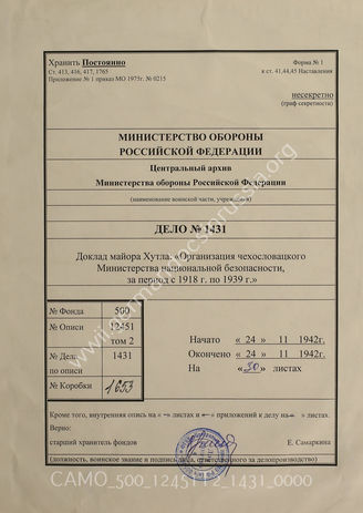 Akte 1431: Unterlagen des Heeresarchivs Potsdam, Zweigstelle Prag: Vortrag von Major Gustav Hutla – Die Organisation des tschechoslowakischen Ministeriums für Nationalverteidigung, 1918-1939