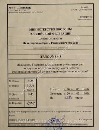 Akte 1445: Unterlagen der Deutschen Heeresmission in Rumänien: Ausarbeitung der Pionier-Abteilung (In 5) Id im Allgemeinen Heeresamt beim Chef Heeresrüstung und BdE im OKH: Die Bäßler-Brücke für 24 t, vom 20. März 1941, Berlin 1941