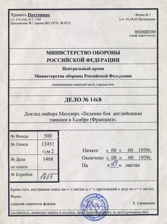 Akte 1468: Unterlagen der Kriegsgeschichtlichen Forschungsanstalt des Heeres: korrigiertes Manuskript von Major Eduard Müller „Der englische Panzerangriff von Cambrai am 20.11.1917 und seine Lehren für die Gegenwart“