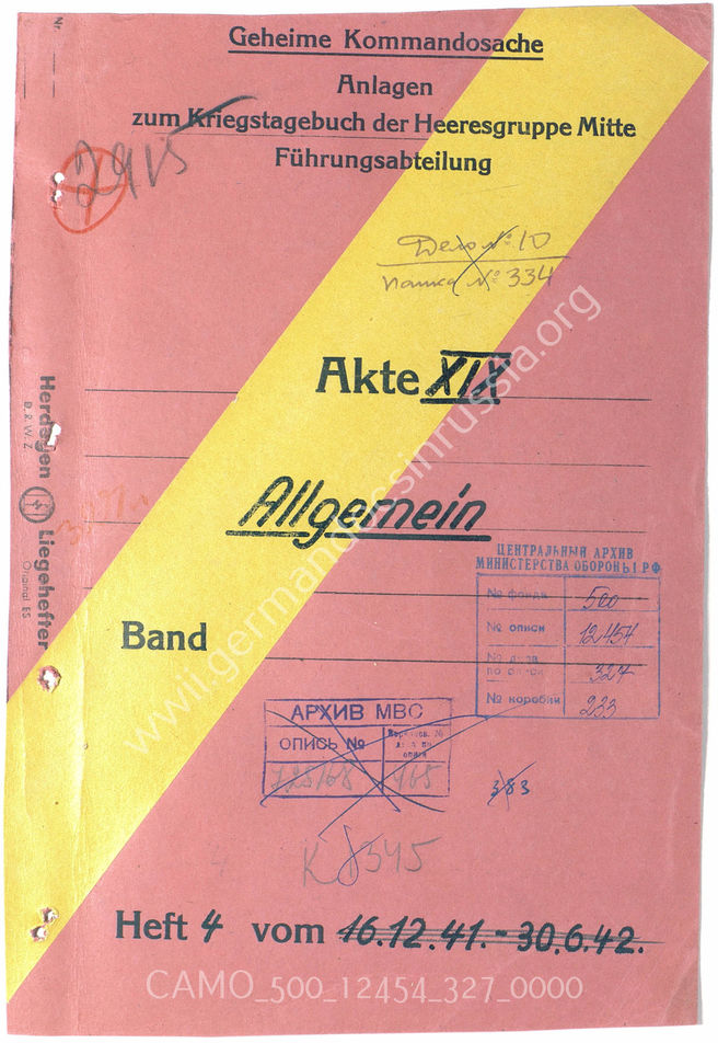 Akte 327. Anlagen zum KTB der Heeresgruppe Mitte – Führungsabteilung – Akte XIX: Allgemein, Heft 4 vom 16.12.1941-30.6.1942