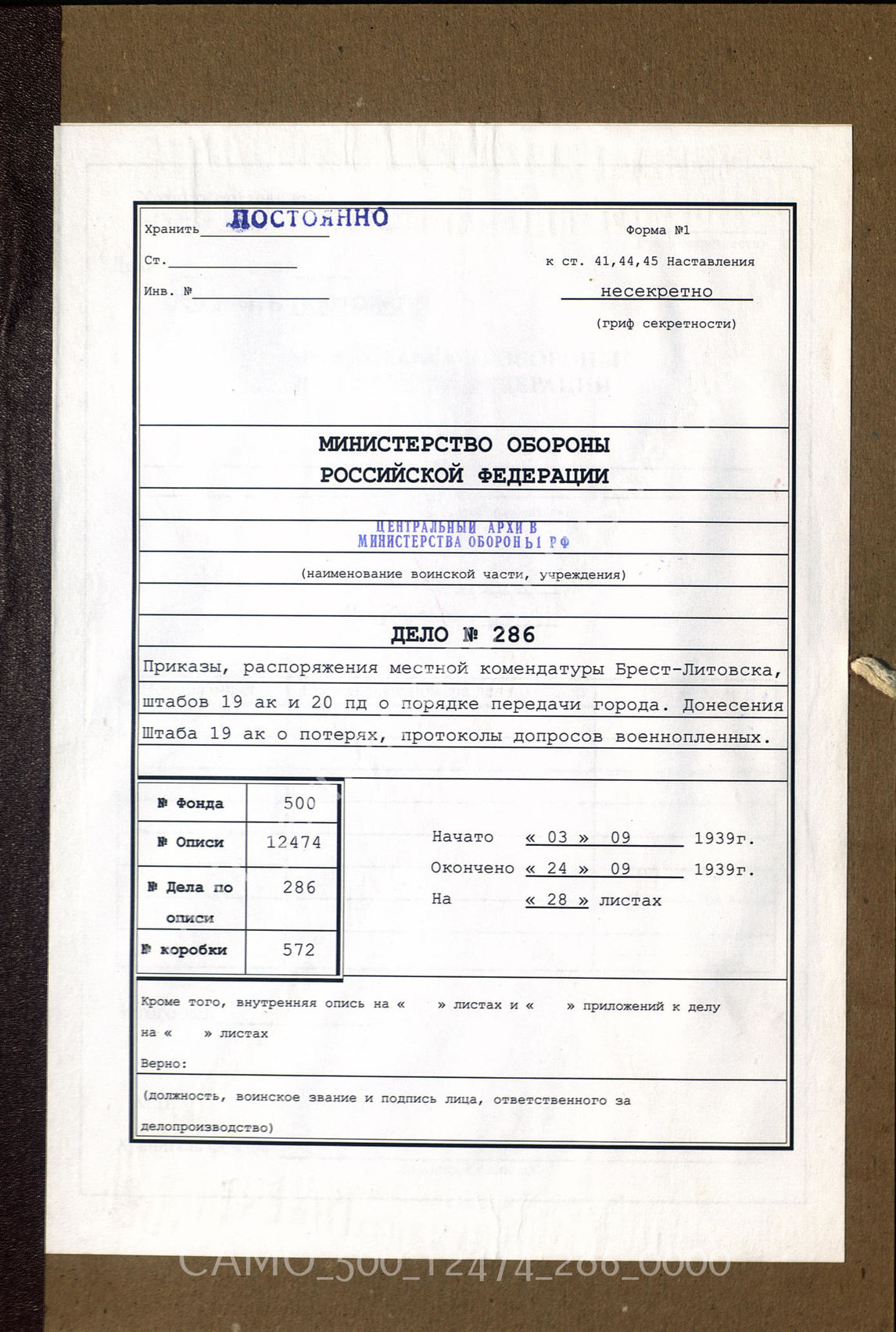 Akte 286. Unterlagen der Ic-Abteilung des Generalkommandos des XIX. Armeekorps: Befehle der Ortskommandantur Brest/Litowsk, Befragungen deutscher Soldaten zur Erschießung von Kriegsgefangenen und deutschen Zivilisten durch polnische Truppen u.a.