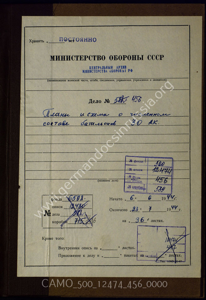 Akte 456. Unterlagen des Korpspionierführers beim Generalkommando des XXX. Armeekorps: Gliederungsübersichten der unterstellten Pionier- und Bautruppen, Stellenbesetzungspläne der Pionier-Bataillone, Stärkemeldungen u.a.