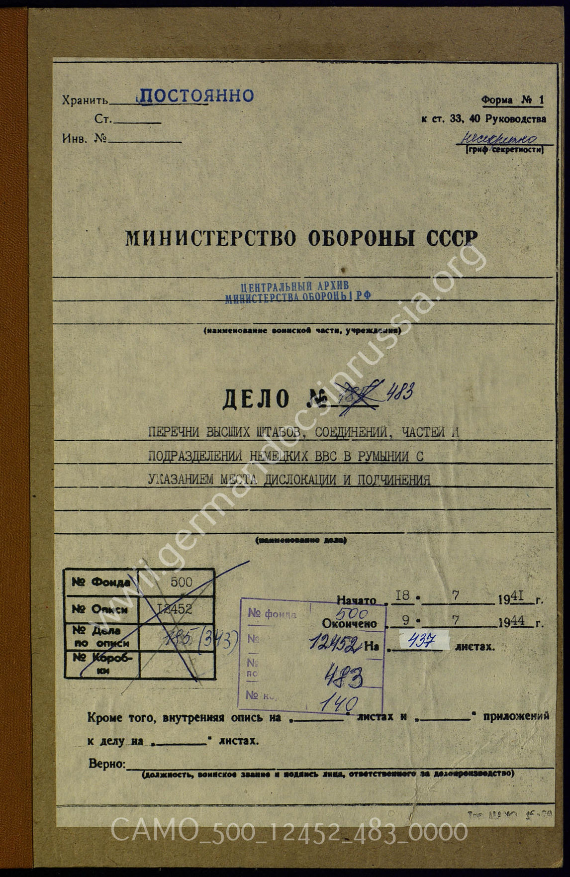 Akte 483. Dienstlicher Schriftwechsel des Luftflottenkommando 4, der deutschen Luftwaffenmission in Rumänien, Liste der fliegenden Verbände und anderen Luftwaffeneinheiten mit Standorten und Unterstellung.