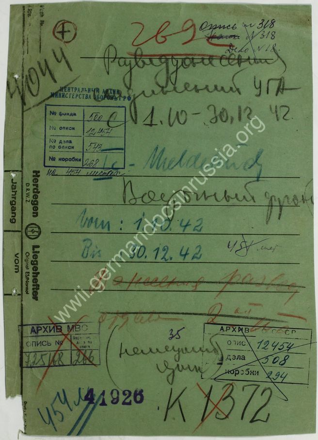 Akte 543. Unterlagen des Ic der Heeresgruppe Mitte: Meldebuch 1.10.-31.12.1942, Feindbeurteilung...