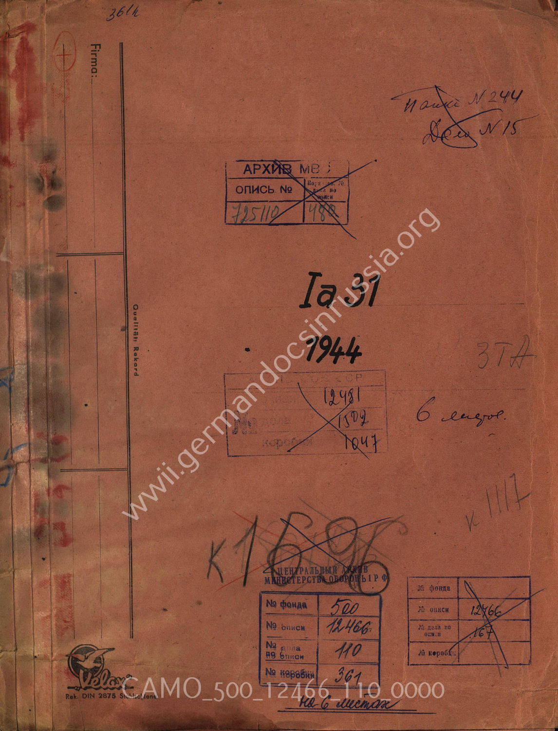 Akte 110. Unterlagen der Ia-Abteilung des PzAOK 3: Notizen zu Truppeninspektionen bei der 56. und 69. Infanteriedivision sowie der 561. Volksgrenadierdivision, Bericht von Major Voss, 206. Infanteriedivision, über den Ausbruch aus Witebsk Ende Juni 1944.