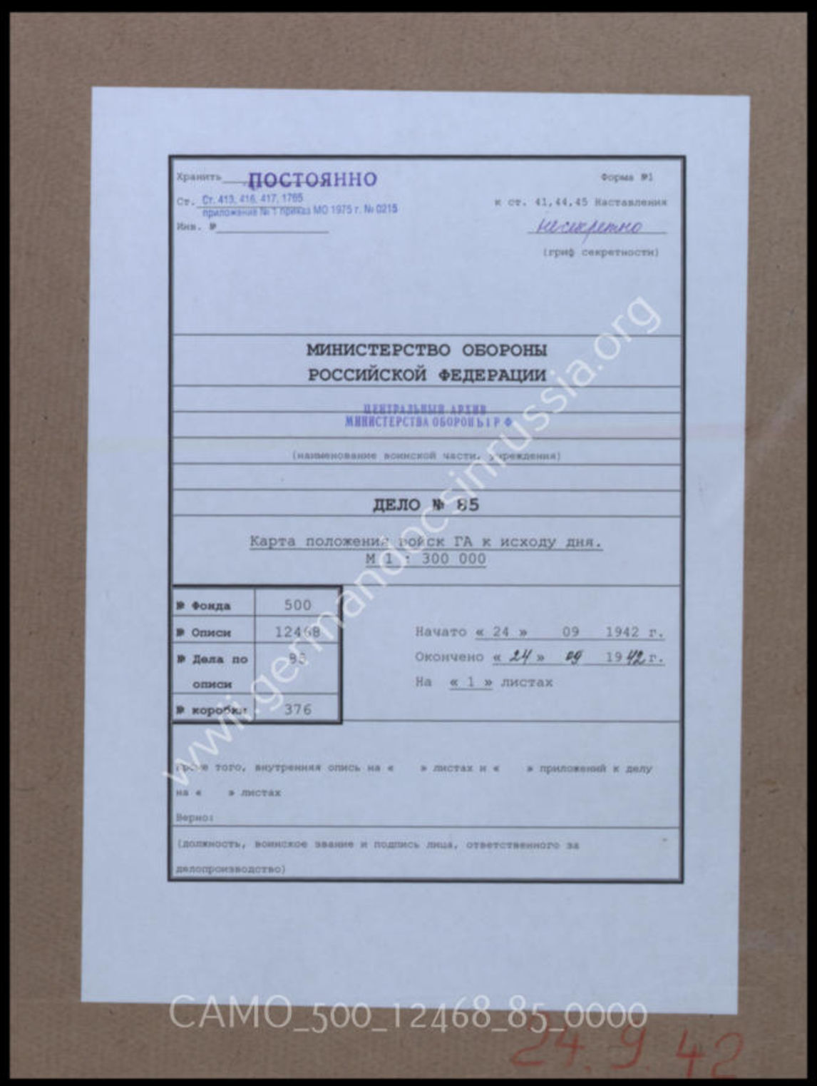 Akte 85: Unterlagen der Operationsabteilung IIIb des Generalstabes des Heeres beim OKH: Karte zur Lage der Heeresgruppe B an der deutsch-sowjetischen Front, einschließlich Zusammenstellung der Panzerlage – Stand 24. September 1942, M 1:300.000