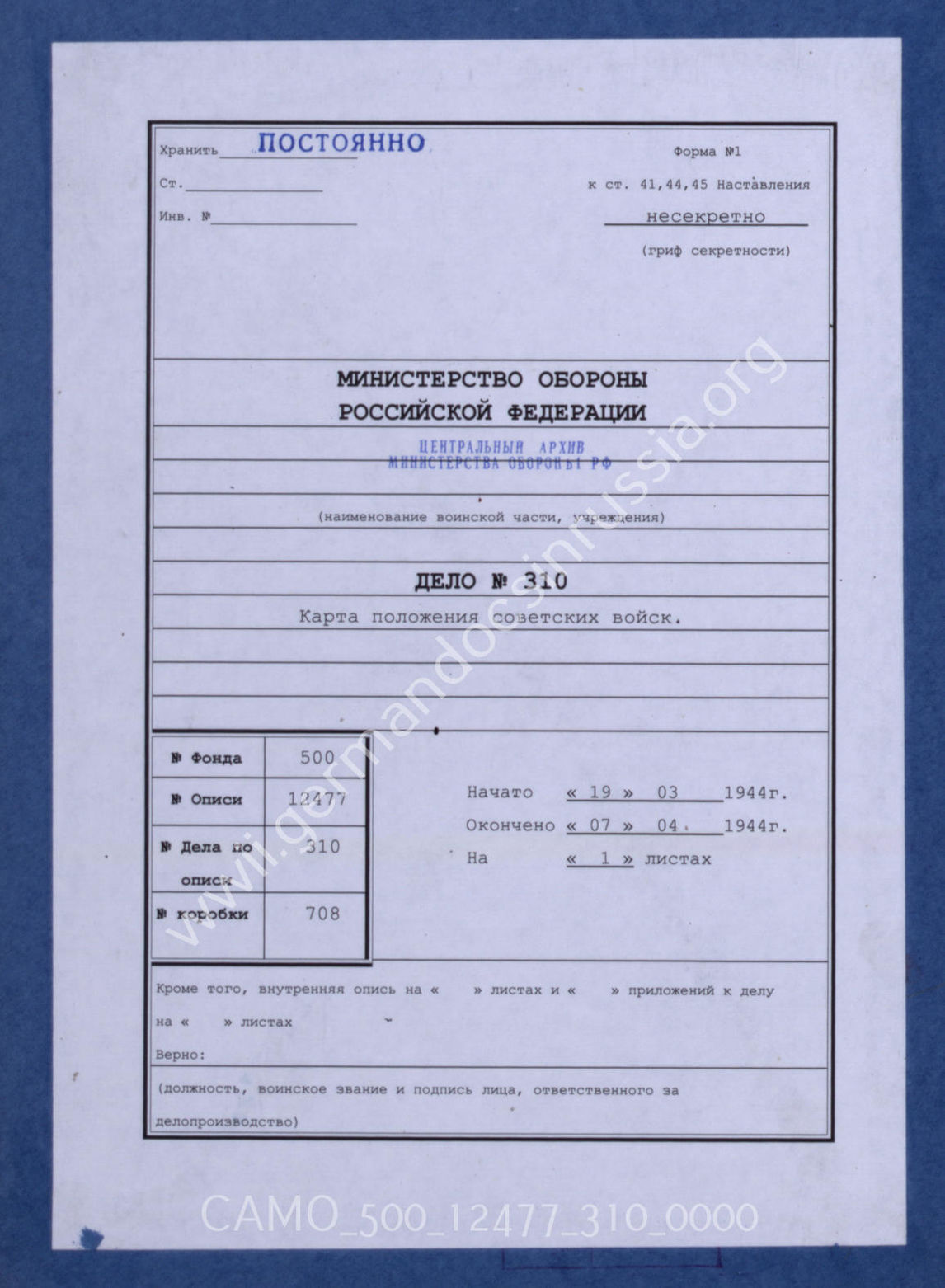 Akte 310. Unterlagen der Ic-Abteilung der 35. Infanteriedivision: Karte der Feindlage im Abschnitt der Division, Stand 19.3.-22.4.1944, M 1:50.000.