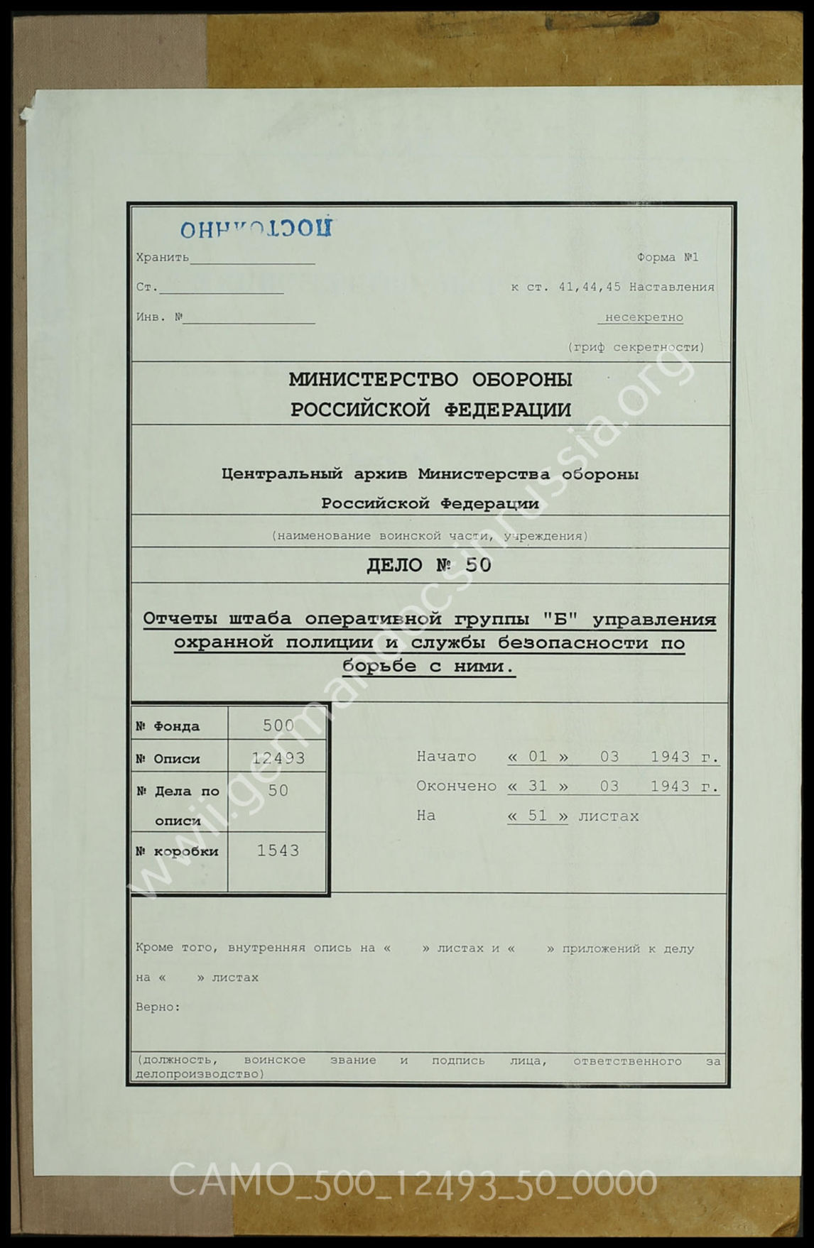 Akte 50. Unterlagen der Einsatzgruppe B der Sicherheitspolizei und des SD: Tätigkeits- und Lagebericht der Abteilung V und Bericht zur allgemeinen Stimmung und Lage der Einsatzgruppe B der Sicherheitspolizei und des SD für den März 1943