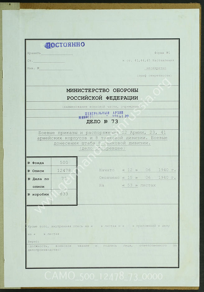 Akte 73. Unterlagen der Ia-Abteilung der 8. Panzerdivision: Anlagenheft 11 zum KTB der Division, 12.-15.6.1940 – Befehle des AOK 12, des XXIII. und XXXXI. Armeekorps, Divisionsbefehle für den Angriff südlich der Somme u.a.