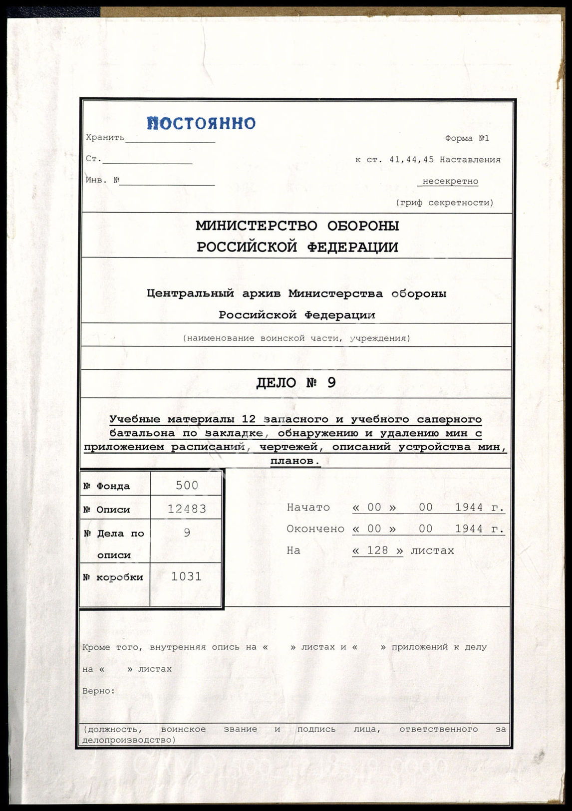 Akte 9. Unterlagen des Baupionier-Ersatz- und Ausbildungsbataillons 12: Merkblätter und Unterlagen für die Pionierausbildung, insbesondere im Einsatz und der Räumung von Minen u.a.