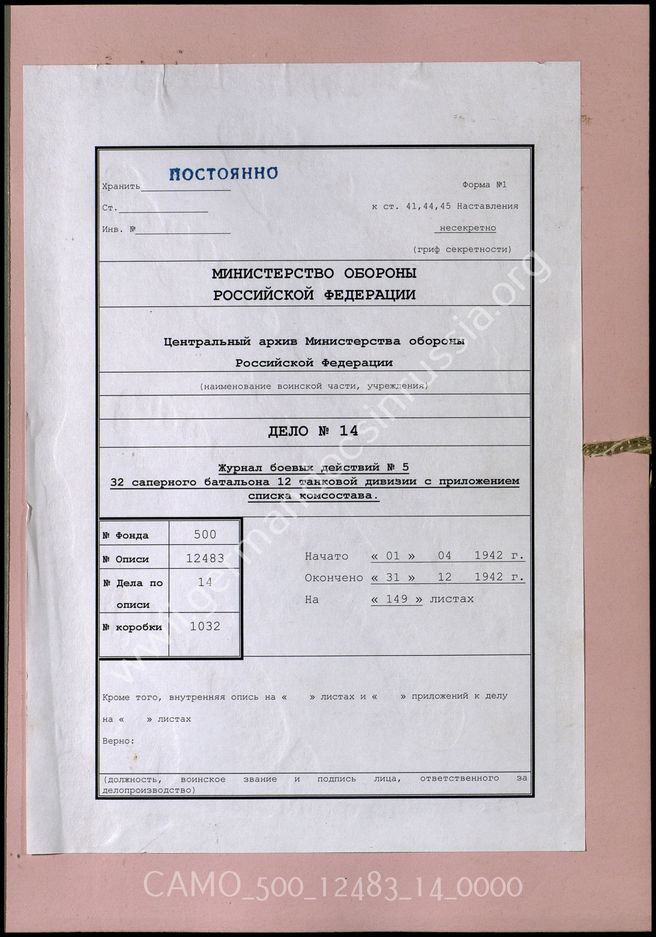 Akte 14. Unterlagen der Ia-Abteilung des Panzer-Pionierbataillons 32 der 12. Panzerdivision: KTB Nr. 5 des Panzer-Pionierbataillons 32, einschließlich Stammtafeln, Kriegsrang- und Verlustliste, 1.4.-31.12.1942.