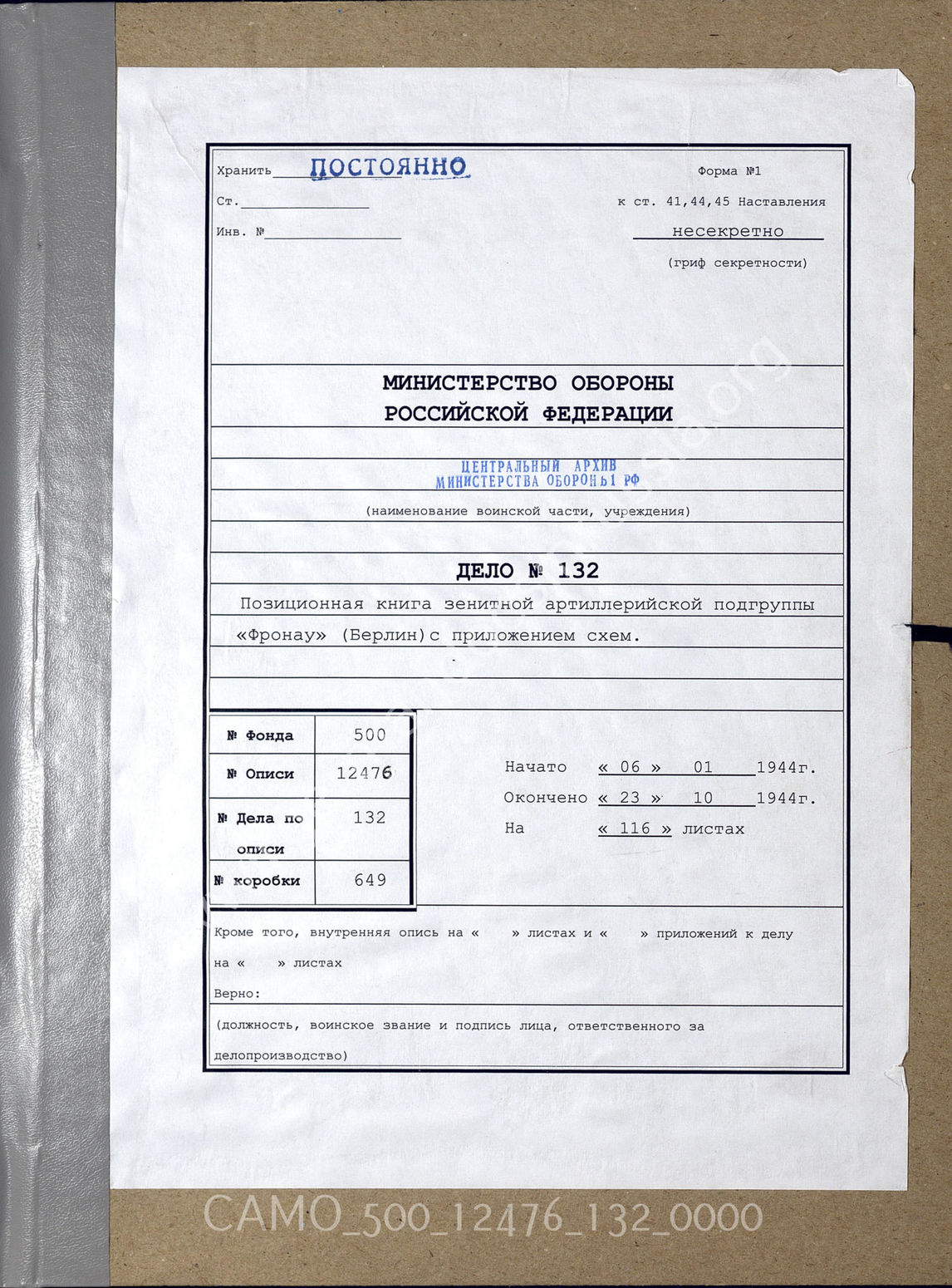 Top CAMO - Bestand 500 Findbuch 12476 - Flakkorps und Flakdivisionen Akte 132. Unterlagen der Ia-Abteilung der 1. Flakdivision: Stellung...
