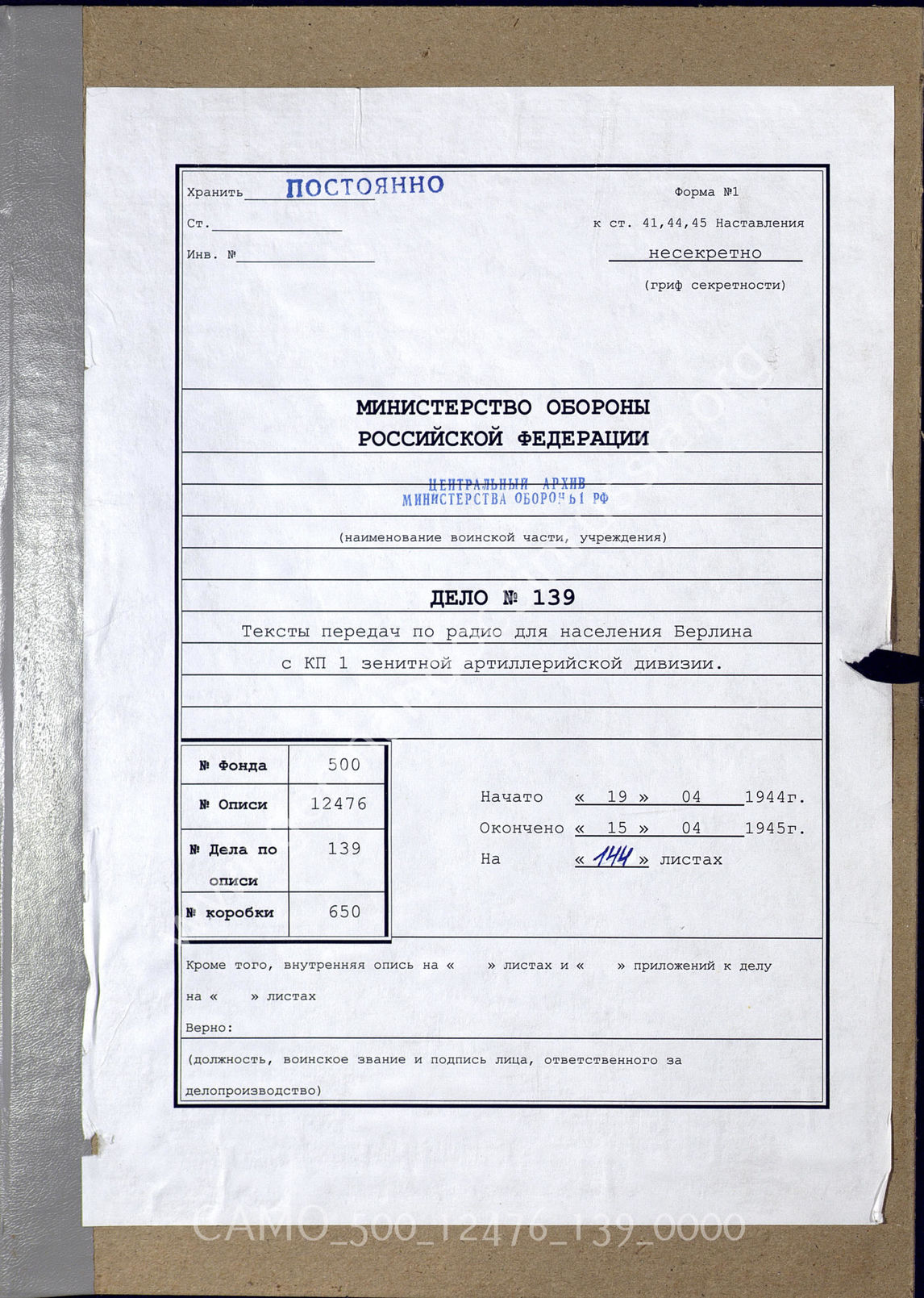 Akte 139. Unterlagen der Ia-Abteilung der 1. Flakdivision: Textentwürfe für Radio- und Lautsprecherdurchsagen für die Berliner Bevölkerung, Briefe der Bevölkerung zu Durchsagen der Flak...