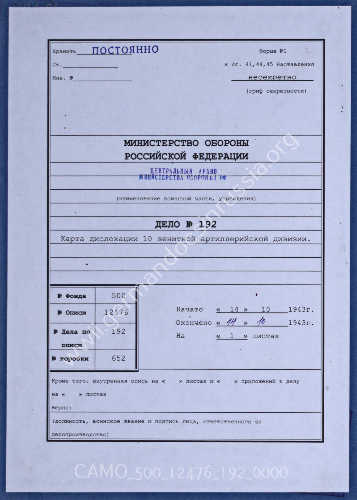 Top CAMO - Bestand 500 Findbuch 12476 - Flakkorps und Flakdivisionen Aktе 192. Unterlagen der Ia-Abteilung der 10. Flakdivision: Karte z...