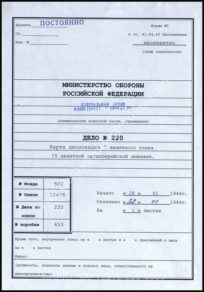 Aktе 220. Unterlagen der Ia-Abteilung der 15. Flakdivision: Karte zum Einsatz des Flakregiments 7 der 15. Flakdivision im Raum Apostolowo – Stand 28.1.1944, M 1:100.000.