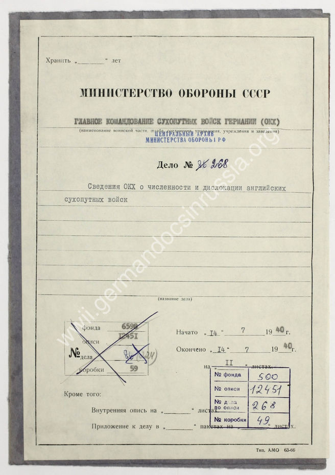 Дело 268. Сведения ОКХ о численности и дислокации английских сухопутных войск.