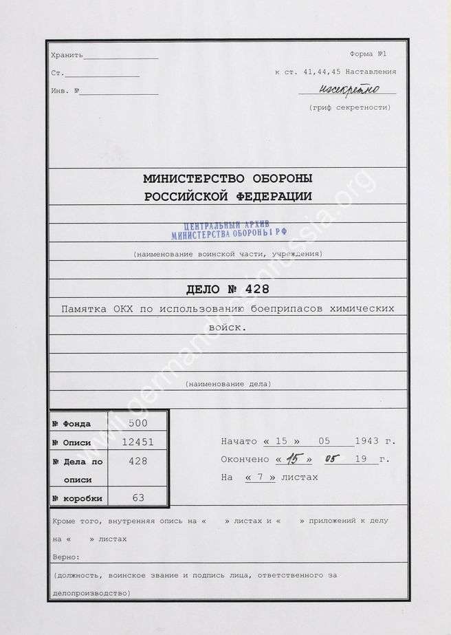 Дело 428. Памятка ОКХ по использованию боеприпасов химических войск.