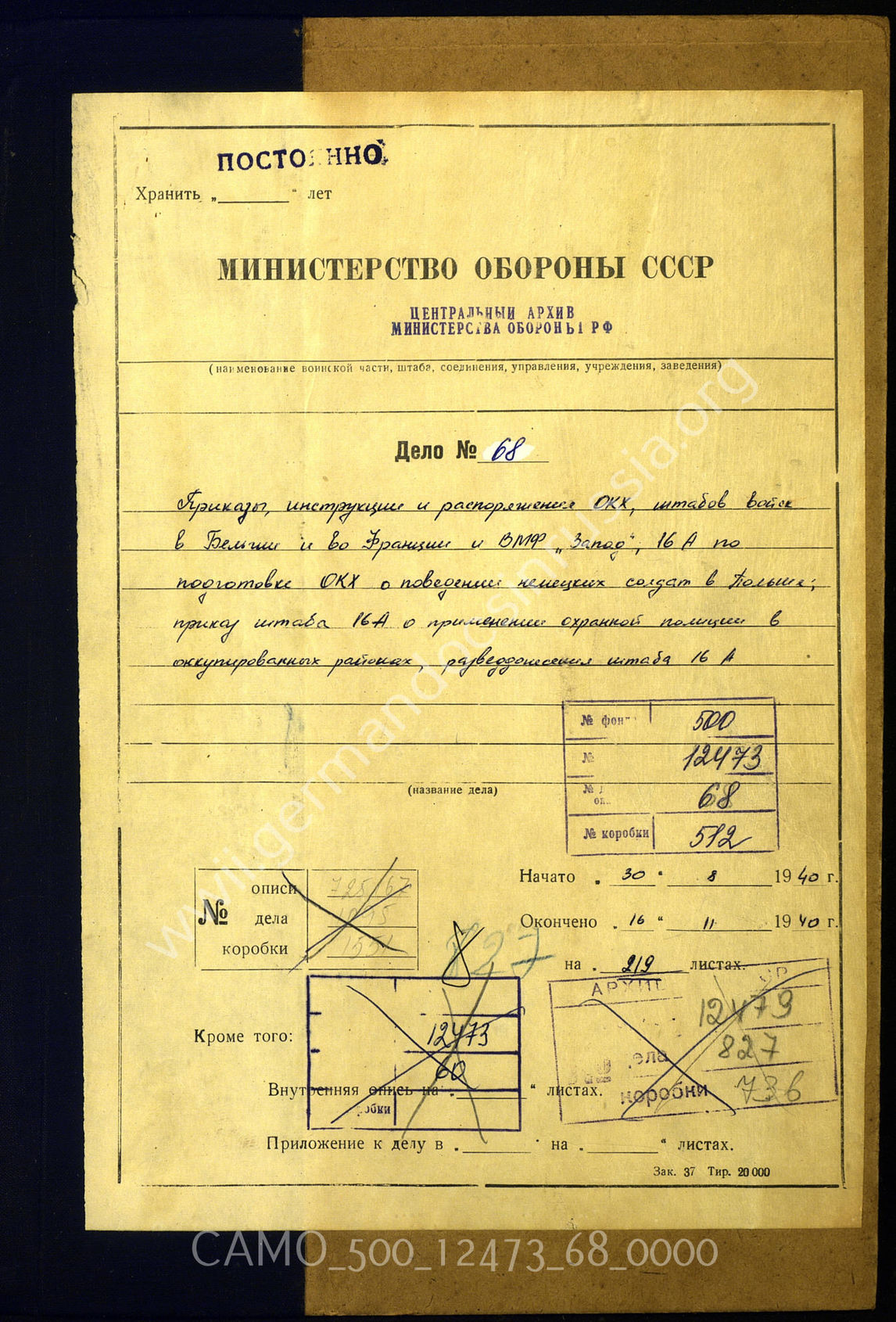 Дело 68. Документы оперативного отдела командования 16-й армии: приказы и распоряжения вышестоящих командных инстанций и 16-й армии о подготовке к высадке в Англии (операция «Морской лев») и проч.