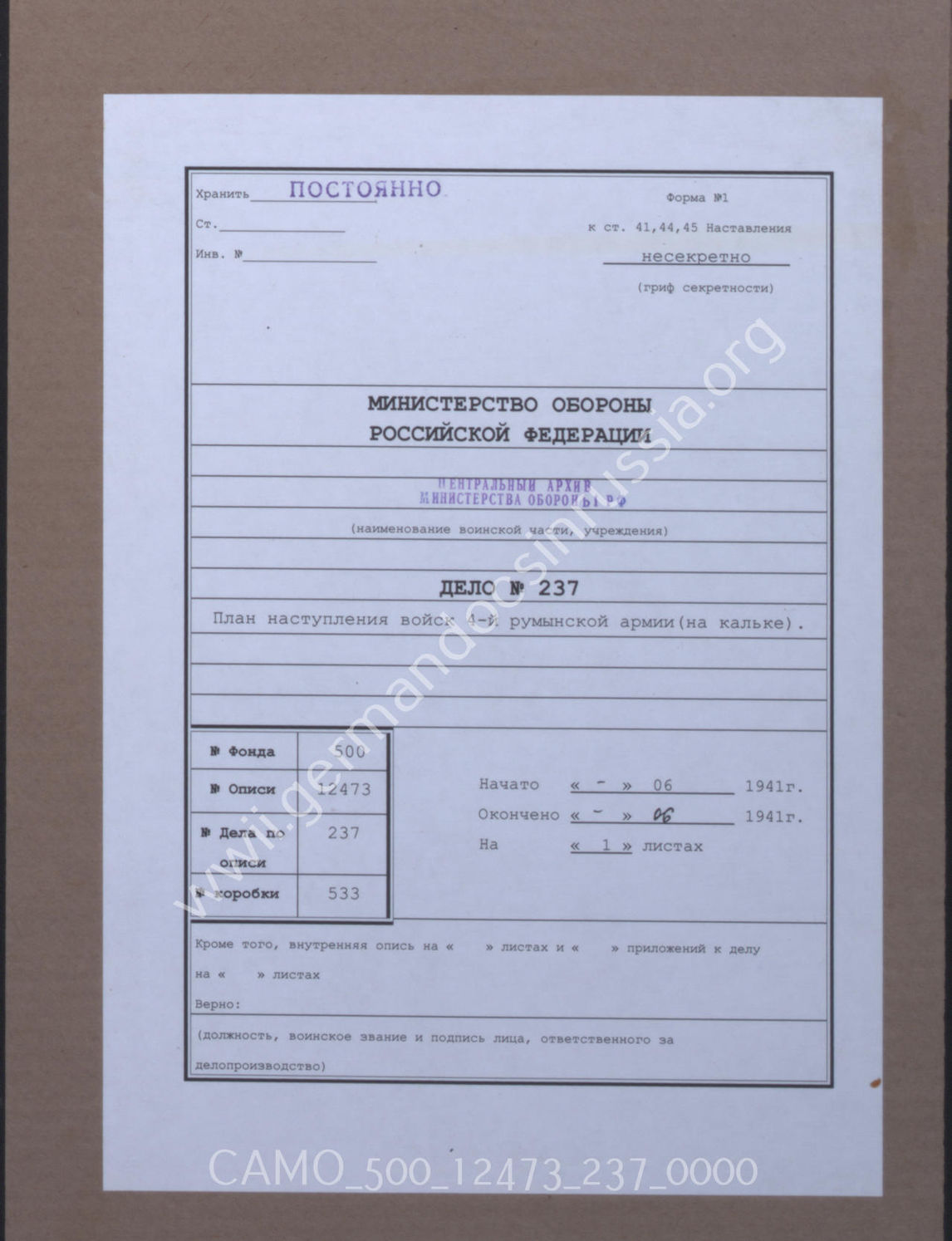 Дело 237. Документы оперативного отделения немецкой миссии в Румынии: калька с указанием направлений наступления 4-й румынской армии во время наступления на Советский Союз – приложение к документу оперативного отдела № 057/41 г.