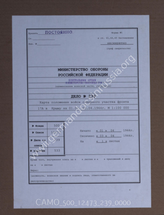 Дело 239. Документы оперативного отделения командования 17-й армии: карта положения частей и соединений 17-й армии в Крыму (северный участок) – по состоянию на 01. – 03.04.1944 г., М 1: 50 000.