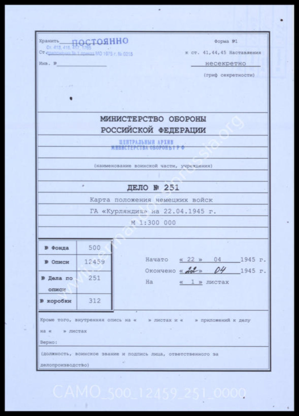 Дело 251. Документы отдела IIIb оперативного управления Генерального штаба сил при ОКХ: карта положения группы армий «Курляндия» - по состоянию на 22.04.1945 г., М 1: 300 000.