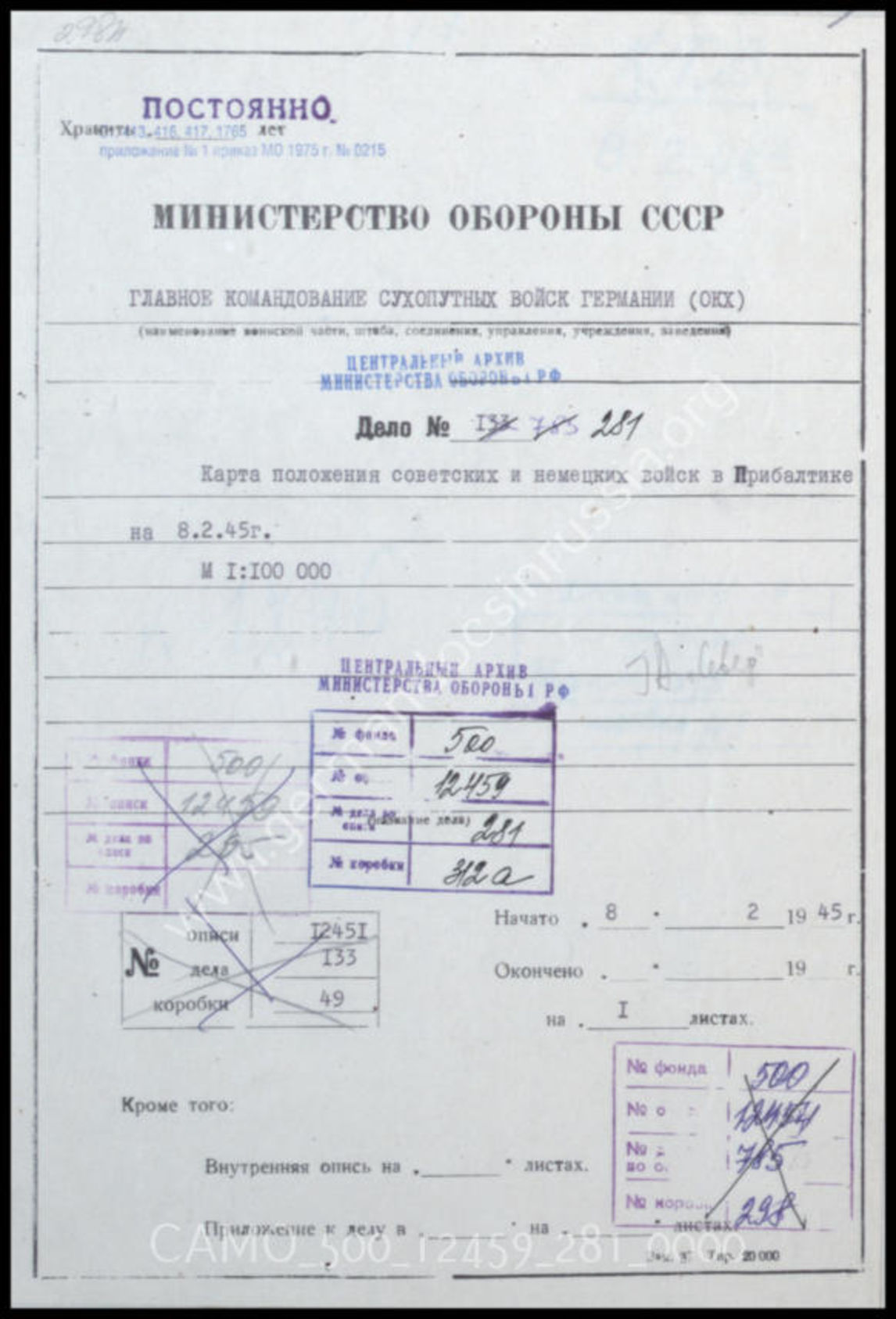 Дело 281. Документы оперативного отделения группы армий «Север»: приложения к журналу боевых действий - карта положения соединений группы армий «Север» и Красной Армии в районе Кёнигсберг-Эльбинг – по состоянию на 08.02.1945 г., М 1:300 000.