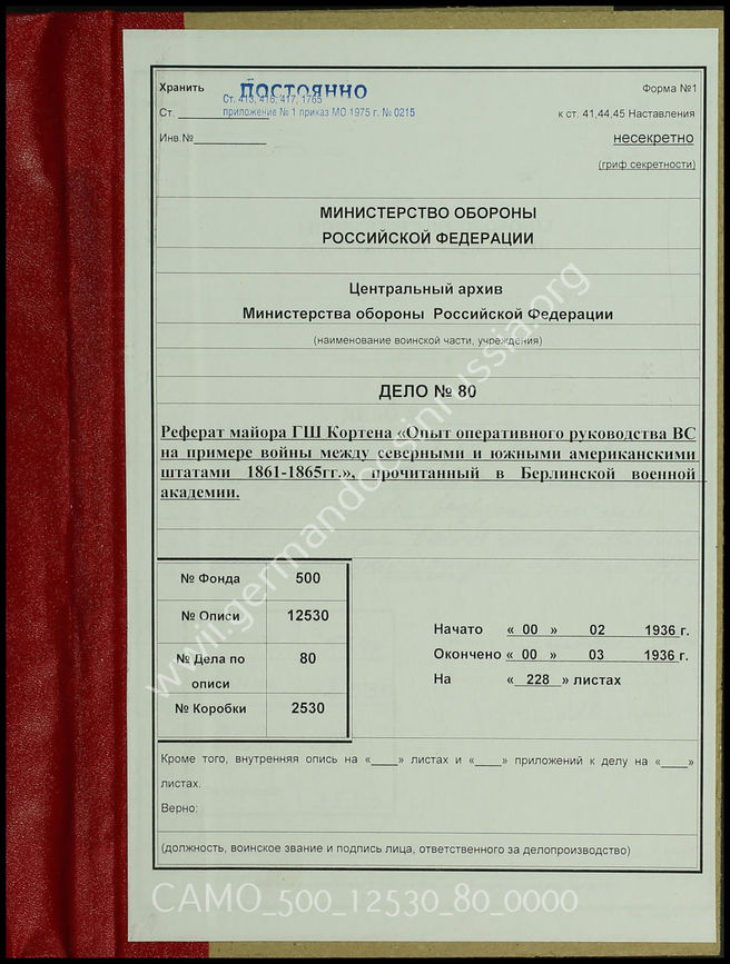 Дело 80. Документы военной академии: доклад майора Гюнтера Кортена «Опыт оперативного руководства вермахта на примере американской гражданской войны» и проч.