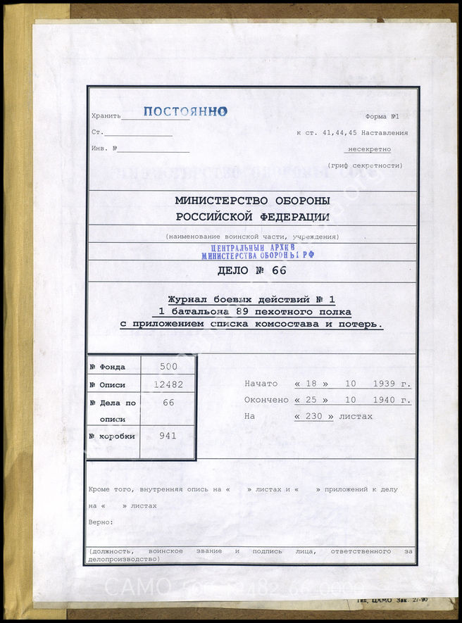 Дело 66. Документы оперативного отделения 1-го батальона 89-го пехотного полка: журнал боевых действий № 2 1-го батальона 89-го пехотного полка, за 18.10.1939 г.