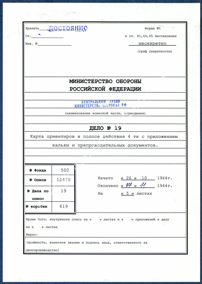 Дело 19. Документы оперативного отдела командования 4-го танкового корпуса –кодированная карта дислокации 4-го танкового корпуса – по состоянию на 07.11.1944 г., М 1: 200 000 и переписка с 6-й армией по этому вопросу.