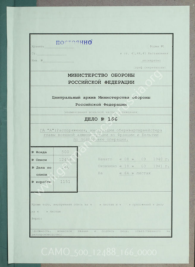 Дело 166: Документация генерал-квартирмейстера при командующем войсками в Бельгии и Северной Франции: указания по высадке десанта на южном побережье Англии между Рамсгитом и Бокс Хиллом и др.