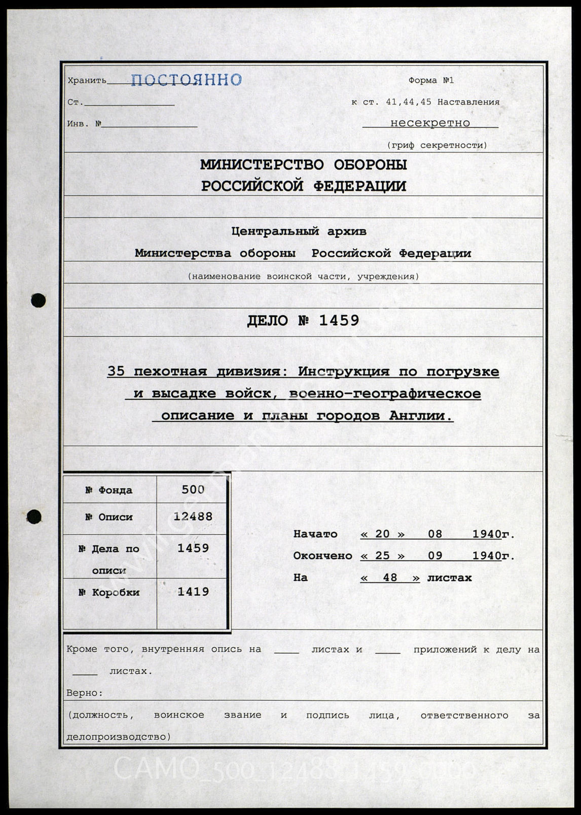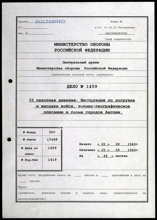 Дело 1459: Документация 1-й роты 35-го истребительного противотанкового дивизиона: информационные листки 35-й пехотной дивизии по погрузке, военно-географические сведения об английском побережье, информация о береговой обороне в районе Дувра (Dover) и пр.